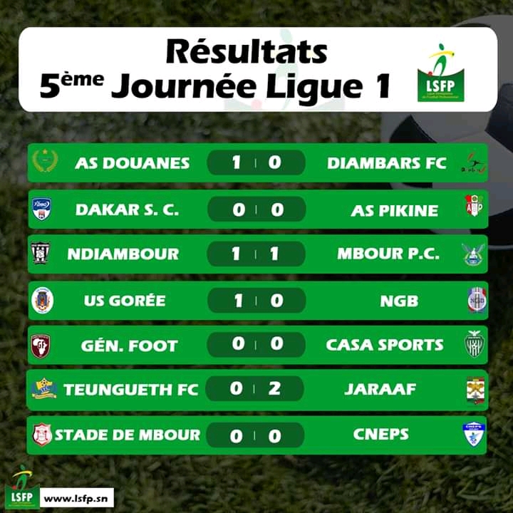 Six buts ont été marqués ce week-end lors de la 5eme journée de la Ligue 1 Sénégalaise de Football. Invaincu depuis Mai 2018, Teungeuth a perdu à domicile cet après-midi au stade Ngalandou Diouf, devant le Jaraaf sur le score de deux buts à zéro. Madické Kane est l’auteur des deux buts sur penalty. C’était le duel des africains et match choc de cette journée.