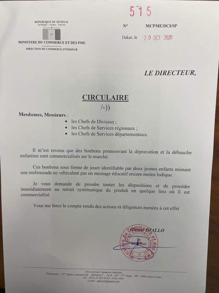 Le Ministère du Commerce a réagi dans la journée en sortant un Circulaire en direction des Chefs de Division, Chefs de Services départementaux et Chef de Services régionaux de «  prendre toutes les dispositions et de procéder immédiatement au retrait systématique du produit en quelque lieu où il est commercialisé ».