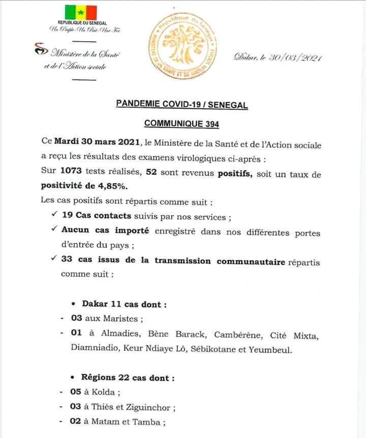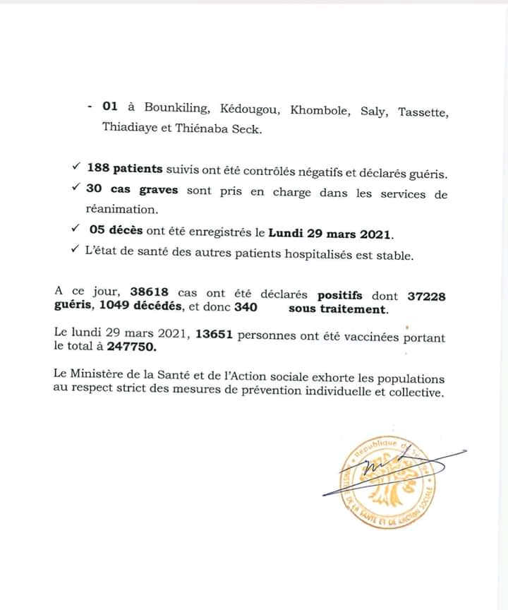 Le ministère de la Santé et de l’action sociale a fait le point sur la situation journalière de l’évolution de la Covid-19 au Sénégal, ce mardi 30 mars 2021.