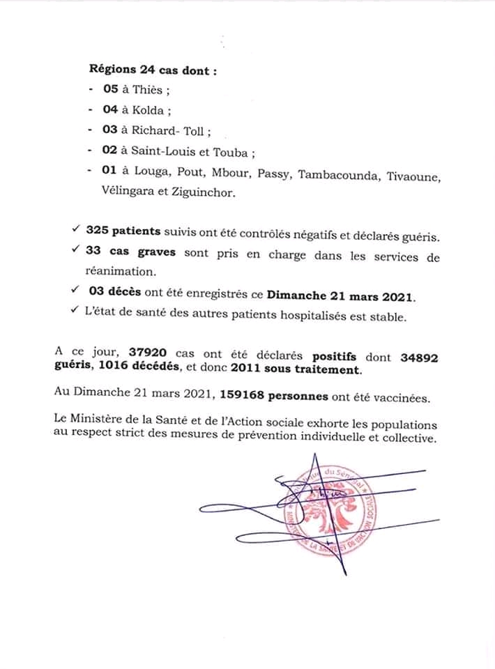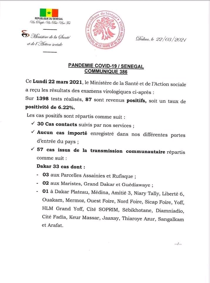 Le ministère de la Santé et de l’action sociale a fait le point sur la situation journalière de l’évolution de la Covid-19 au Sénégal, ce lundi 22 mars 2021.