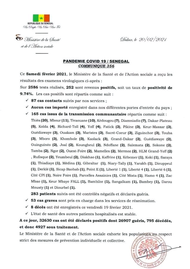Le ministère de la Santé et de l’action sociale a fait le point sur la situation journalière de l’évolution de la Covid-19 au Sénégal, ce samedi 20 février 2021.