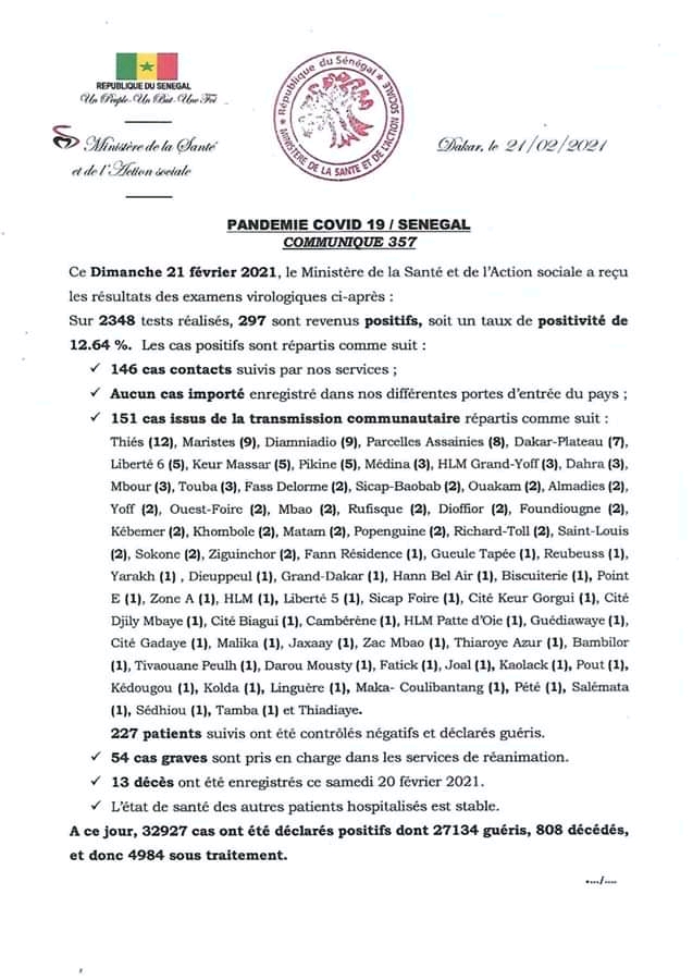 Le ministère de la Santé et de l’action sociale a fait le point sur la situation journalière de l’évolution de la Covid-19 au Sénégal, ce dimanche 21 février 2021.