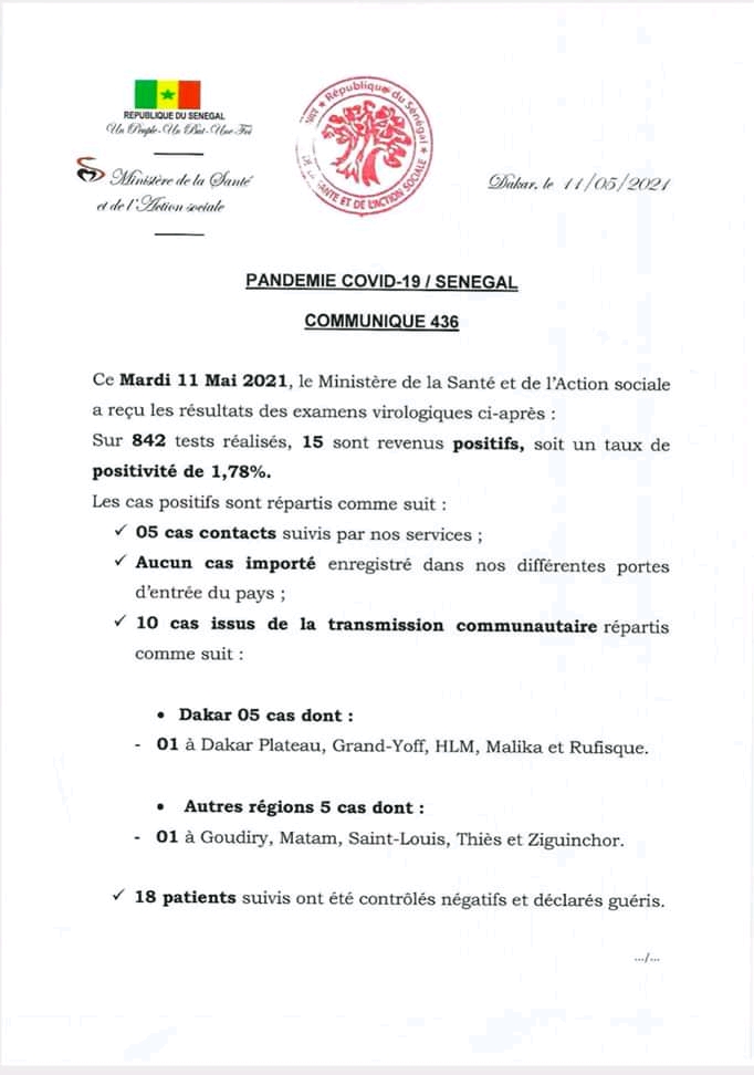 Sur 842 Tests – 15 nouveaux cas, dont 05 cas contacts et 10 cas communautaires