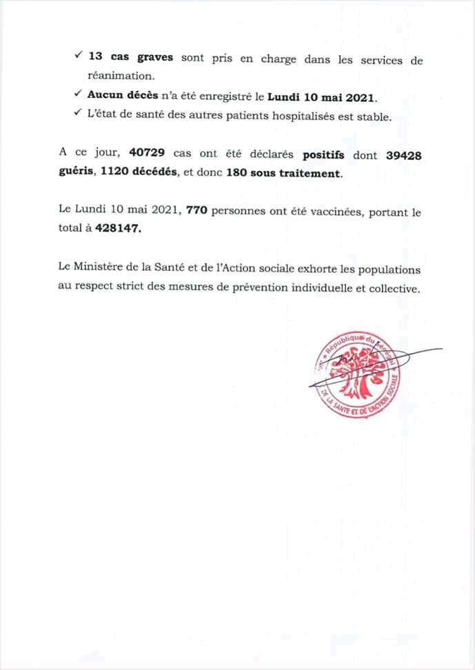 – 18 guéris , 13 cas graves- 00 nouveau décès. A ce jour 40729 cas ont été déclarés positifs dont 39428 guéris 1120 décès 180 sous traitement