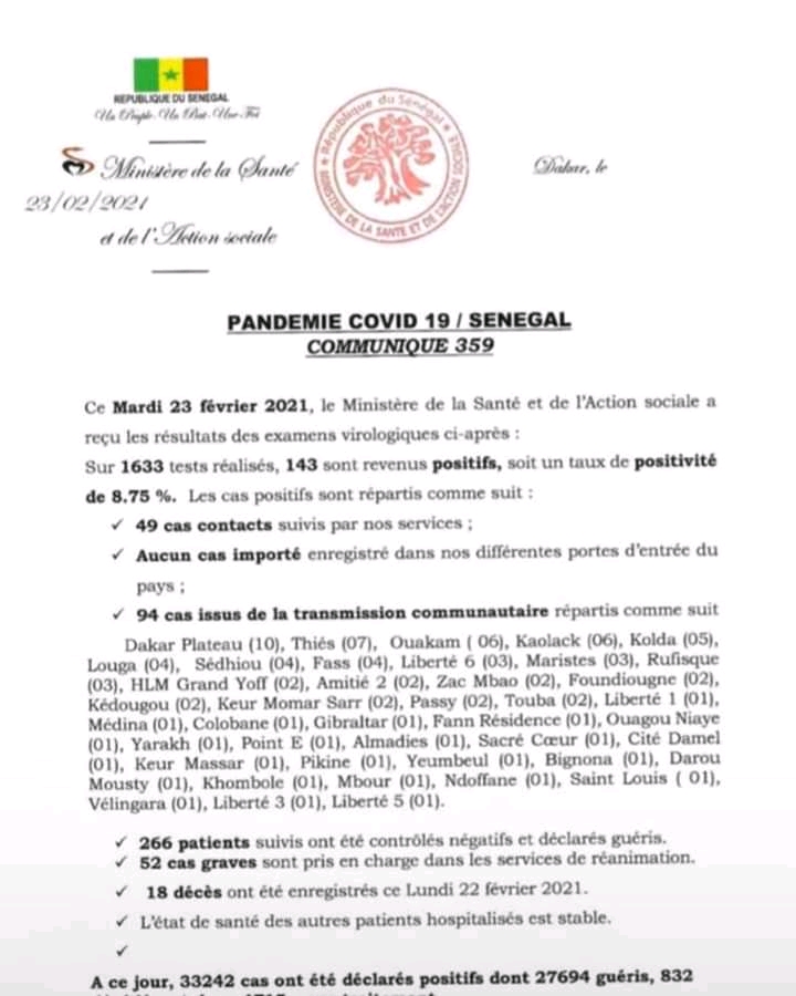Le ministère de la Santé et de l’action sociale a fait le point sur la situation journalière de l’évolution de la Covid-19 au Sénégal, ce mardi 23 février 2021.