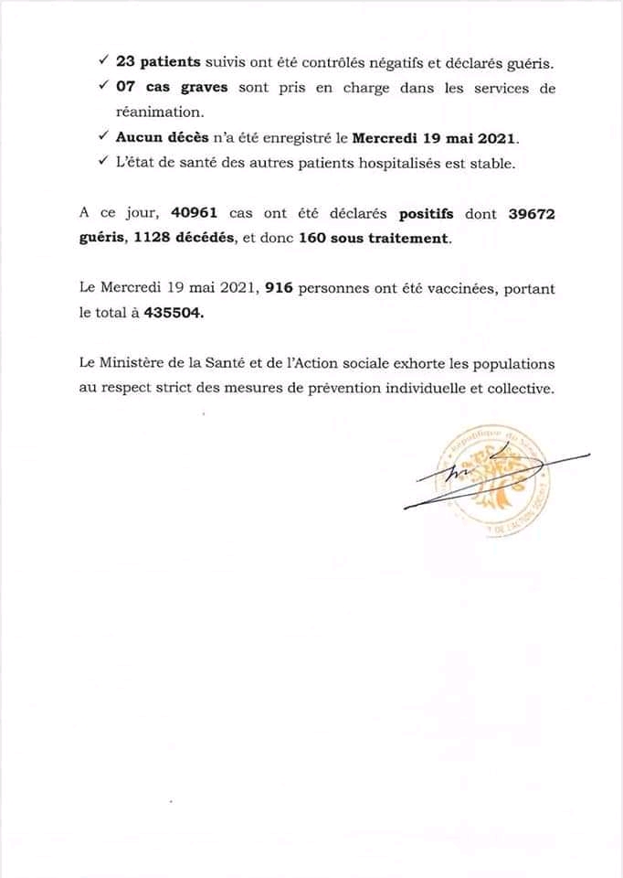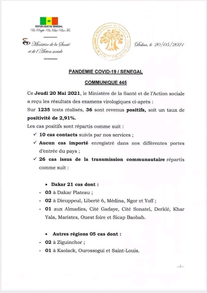 Le Sénégal a enregistré 36 nouvelles infections liés à la pandémie du coronavirus, a annoncé ce jeudi 20 mai, le ministère de la Santé et de l’action sociale dans son bilan quotidien. 26 cas sont issus de la transmission communautaire.