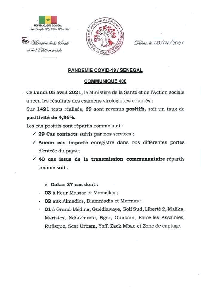 Sur 1421 tests réalisés, 69 sont revenus positifs au coronavirus soit un taux de positivité de 4,86 %. Il s’agit de 29 contacts suivis et 40 cas issus de la transmission communautaire, répartis comme suit (document ci-dessous).