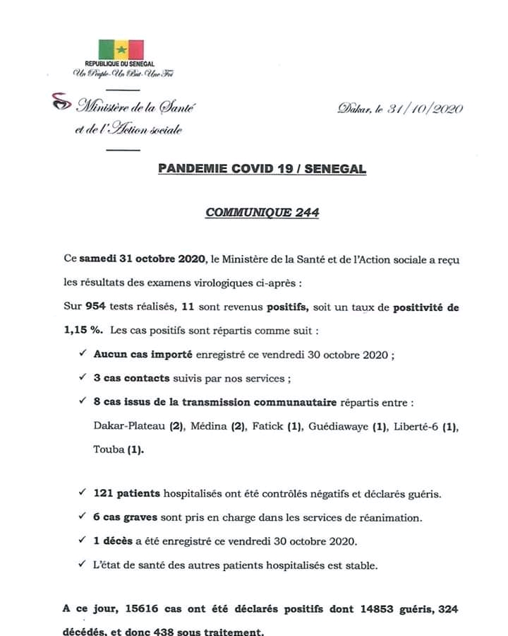 CORONAVIRUS SÉNÉGAL SITUATION DU 31 OCTOBRE 2020