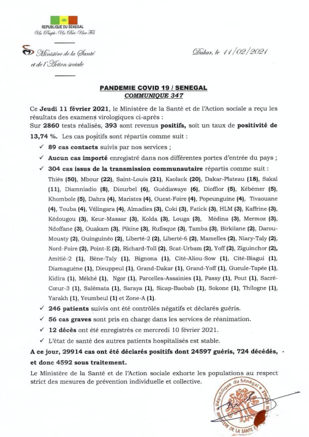 Covid-19/Sénégal : 12 décès et 393 tests positifs et 56 cas graves
