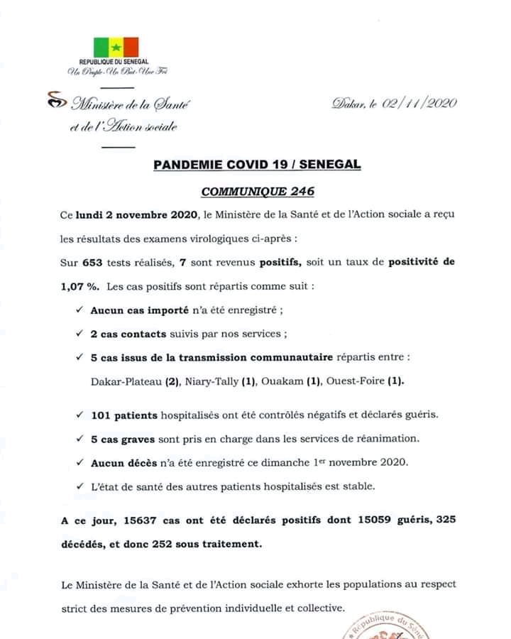 CORONAVIRUS SÉNÉGAL SITUATION DU 02 NOVEMBRE 2020