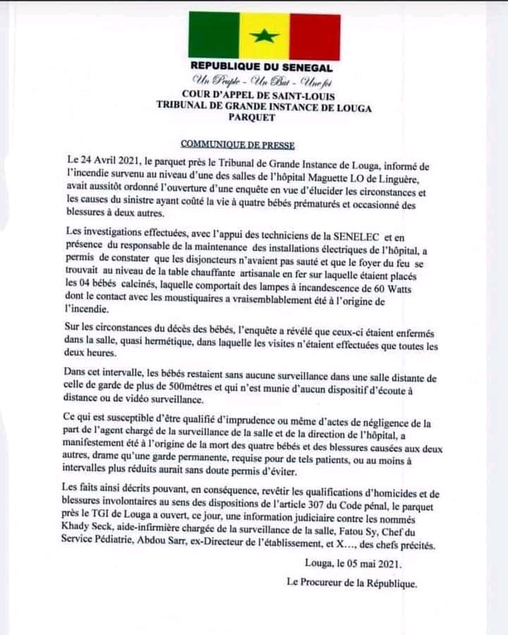 Le Parquet près le Tribunal de Grande Instance de Louga retient l’homicide et les blessures involontaires et a ouvert une information judiciaire contre les nommés Khady Seck, aide-infirmière chargée de la surveillance de la salle, Fatou Sy, Chef du Service Pédiatrie, Abdou Sarr, ex-Directeur de l’établissement, et X., des chefs précités.