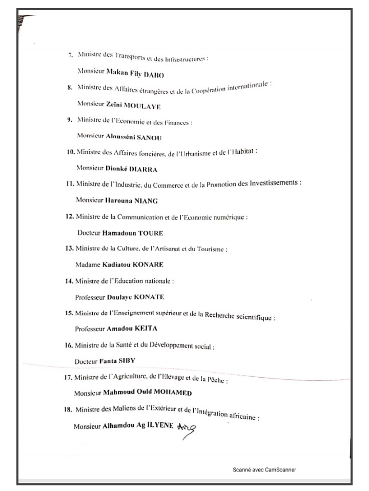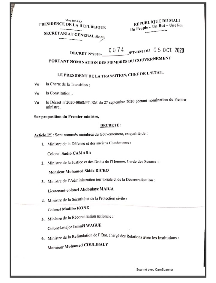 Sur proposition du Premier Ministre Moctar OUANE, le Président de la transition Bah N’daw vient de nommer les membres du Gouvernement de la transition