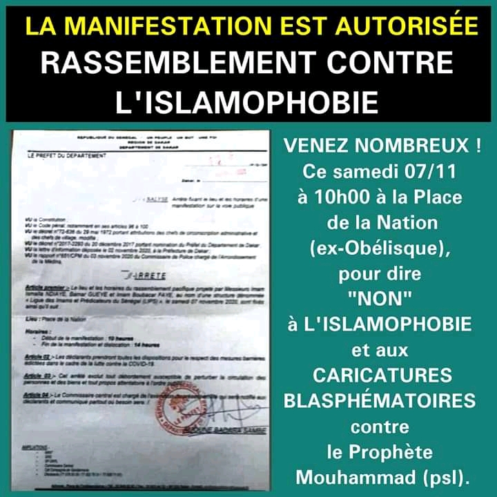 Le Rassemblement des Sénégalais contre l’islamophobie ( RSI ) vous confie à la grande marche de prestation qu’il organisera ce samedi 7 novembre 2020 à 10h à la place de la nation pour dire non à l’islamophobie et aux caricatures blasphématoire contre le prophète (PSL).