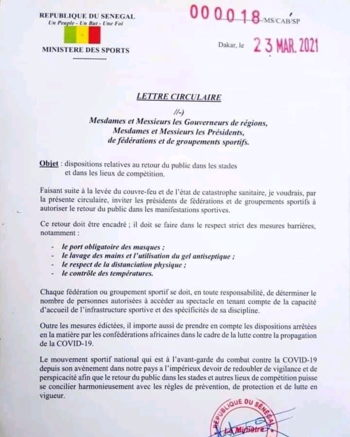 People & Sport Retour du grand public : Le Ministre des Sports Makhar Ba ouvre les stades Par Lerepublicainsn - mars 23, 2021 0 678 Share Facebook Twitter WhatsApp Linkedin "/> C’est maintenant officiel. À travers une lettre circulaire, le Ministre des Sports Makhar Ba prend ka décision d’ouvrir les stades aux publics avec le respect strict des mesures barrières pour empêcher la propagation du virus du Coronavirus.